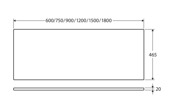 Width: 600/750/900/1200/1500/1800mm x Depth: 465mm x Height: 20mm.
