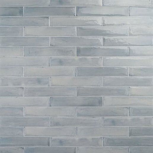 Small flakes of marble, fragments and glass find their elegant geometric composition in space, flanked by a brick format with understated pastel tones.