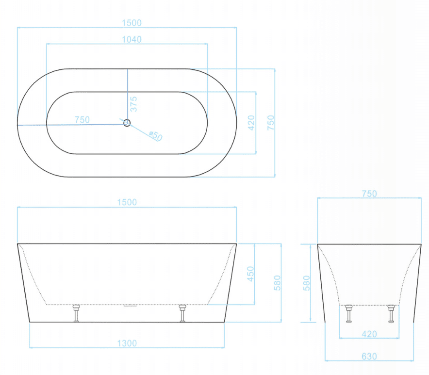 This Galaxy Oval bath measures 150x75x58cm in dimensions.