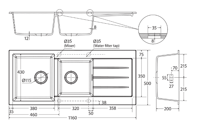 | Options | No Tap Hole, 1 Tap Hole, Left Bowl, 1 Tap Hole, Right Bowl, 2 Tap Hole, Left Bowl, 2 Tap Hole, Right Bowl |